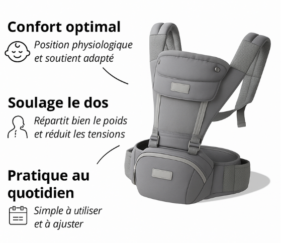 soutient le bas du dos et répartit le poids du bébé sur les hanches, réduisant la fatigue du porteur.